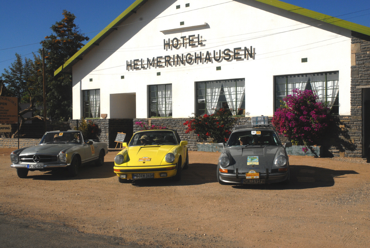 Im Rahmen einer Oldtimer-Rallye Okt./Nov. 2008 durch Süd-Afrika und Namibia war ein Etappenziel das Hotel Helmeringhausen im gleichnamigen Ort in Namibia. Wir haben dieses Hotel und den Wirt als sehr gastfreundlich kennen gelernt und uns nach einer langen Tagesetappe über Schotter- und Staubpisten gut erholen können. Auch der Tankwart gegenüber des Hotels war sehr hilfsbereit, da es an unseren Fahrzeugen immer etwas zu schrauben gab. Wir waren 20 Oldtimer-Fahrzeuge aus Deutschland und der Schweiz, die mittels Container nach Kapstadt verschifft wurden. Die Rallye dauerte 5 Wochen und war insgesamt 7.500 km lang. Da wir selbst aus Arnsberg kommen, waren wir an dem Ort Helmeringhausen/Namibia sehr interessiert und senden Ihnen diesen Gruß mit unserem Auto vor dem Hotel Helmeringhausen.