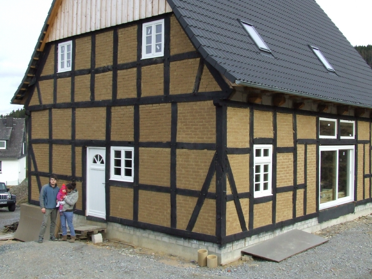 Mit dem Einzug sind die Arbeiten aber noch nicht beendet: „Das Gefache außen muss noch verputzt werden“, erläutert Sebastian Overhageböck. „Durch den Kalkputz erhält es dann das für das Sauerland typische, schwarz-weiße Aussehen.“ Das kann allerdings frühestens 2016 erledigt werden, wenn das Fachwerk nach dem Wiederaufbau nicht mehr arbeitet. Geplant ist außerdem eine Internetseite, auf der das gesamte Bauprojekt dokumentiert werden soll. Dort sollen Interessierte neben der Fotodokumentation vom Aufbau des Ständerwerks und anderen Fotos und Videos auch viele weiterführende Informationen bekommen können. Doch bis die digitale Baustelle in Angriff genommen wird, hat die Familie Overhageböck erst noch viel Handarbeit zu erledigen.