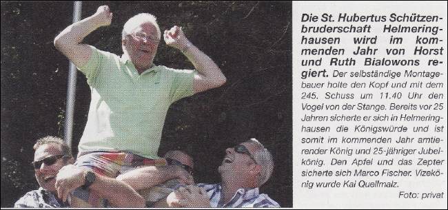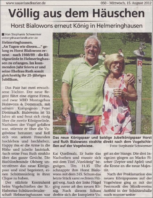 Die St. Hubertus Schützenbruderschaft Helmeringhausen e.V. feiert vom 11. bis 13. August 2012 unter der Regentschaft des Königspaares Carsten und Gabi Hillebrand ihr traditionelles Schützenfest.